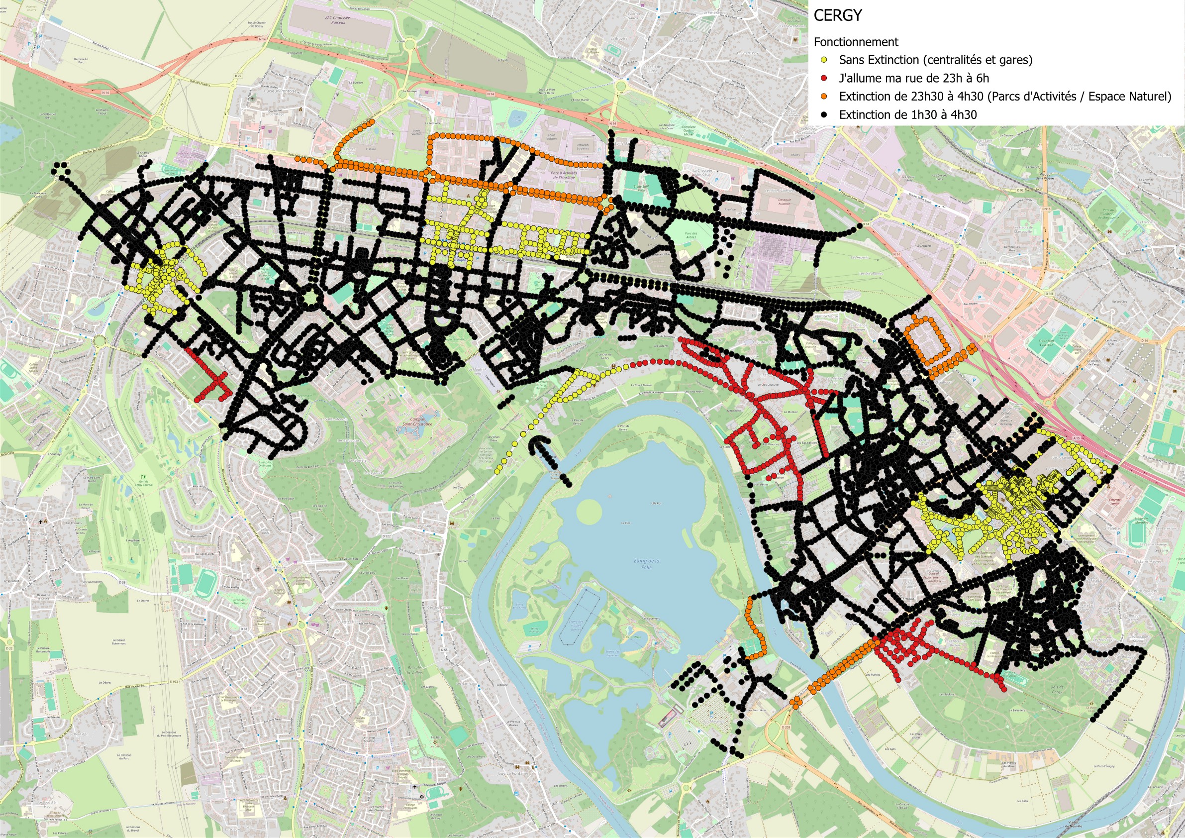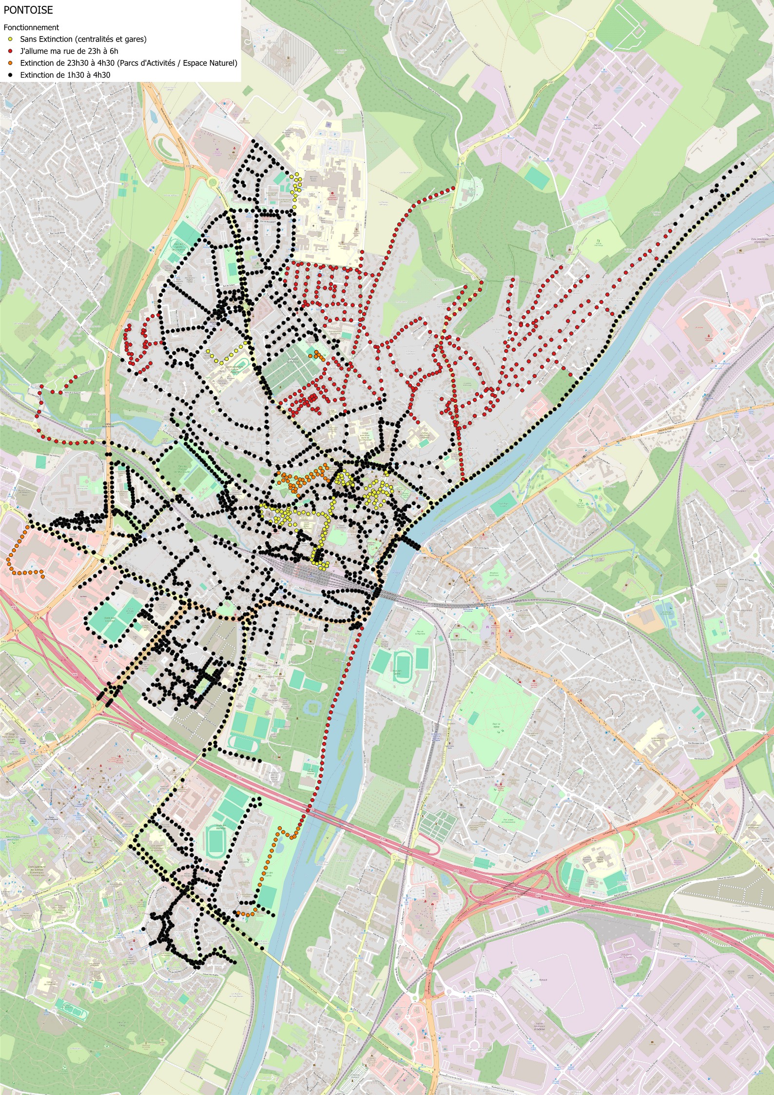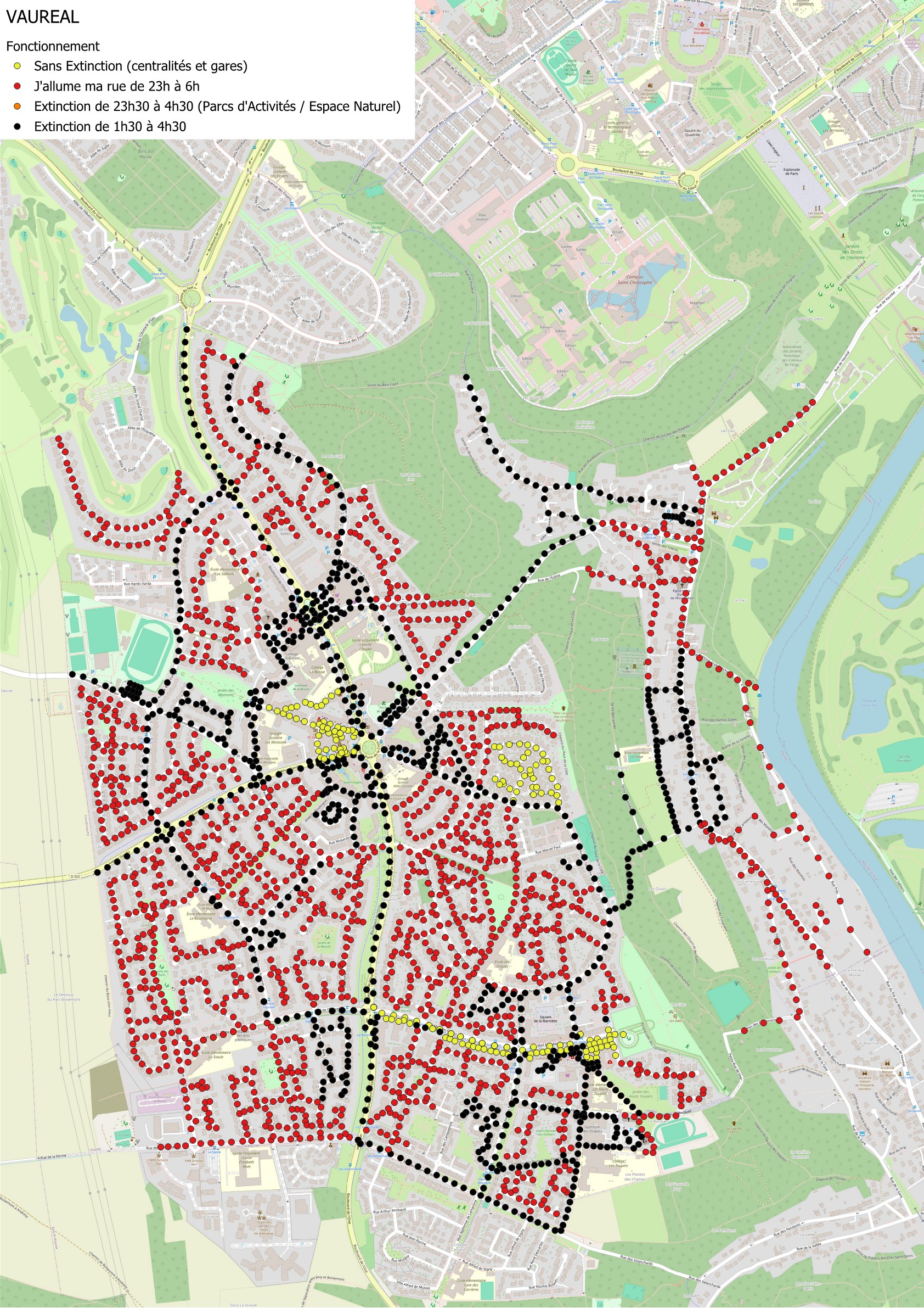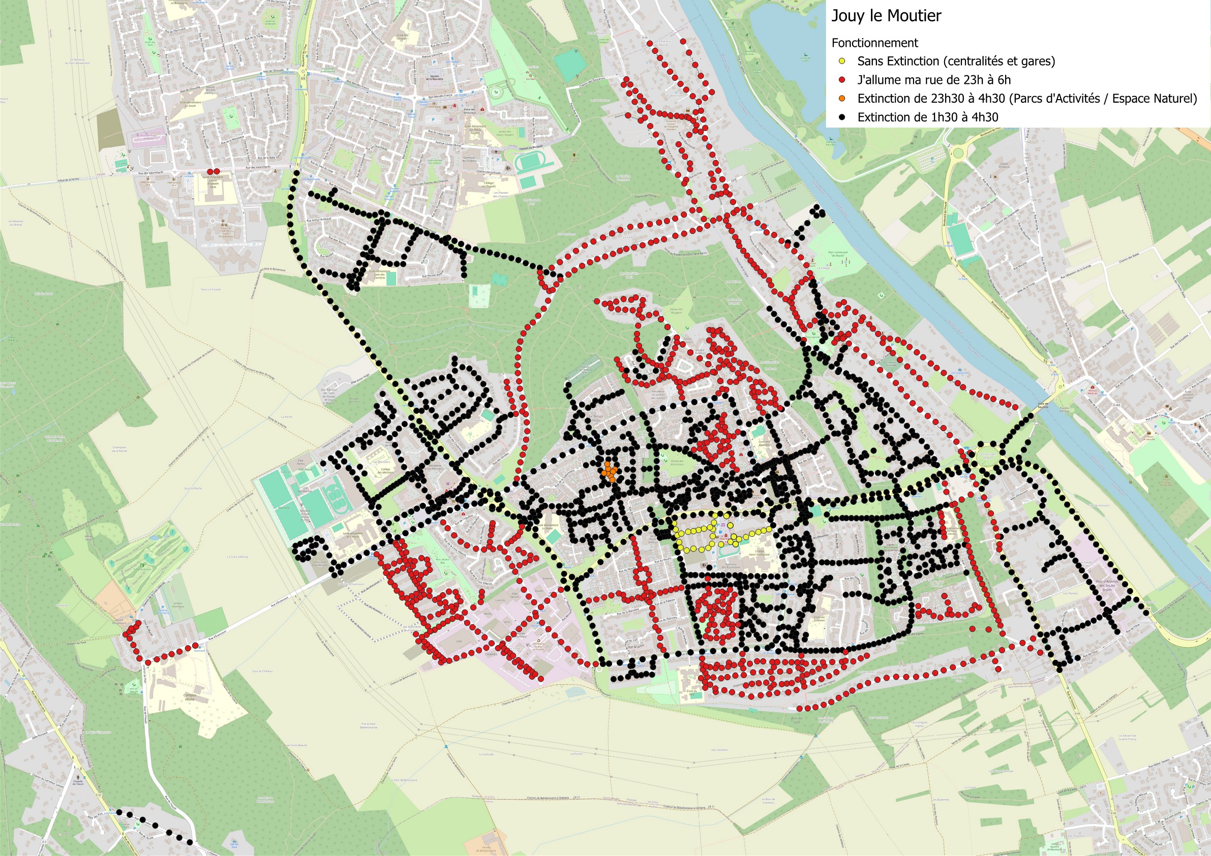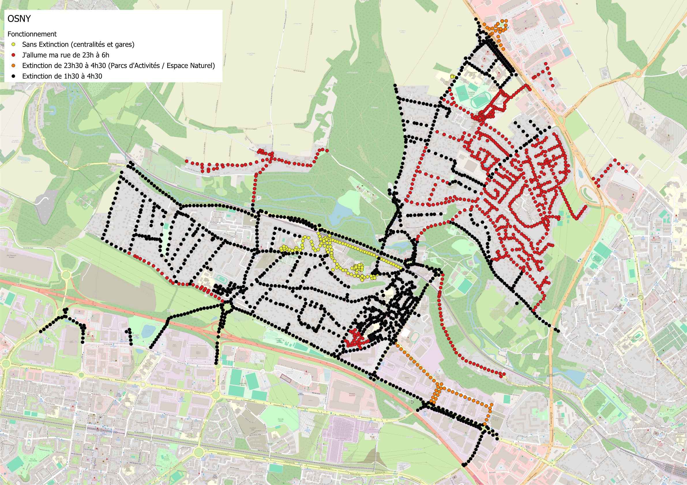 - zones identifiées en Rouge : extinction de 23h00 à 6h00, avec la possibilité de rallumer avec « J’allume ma Rue »