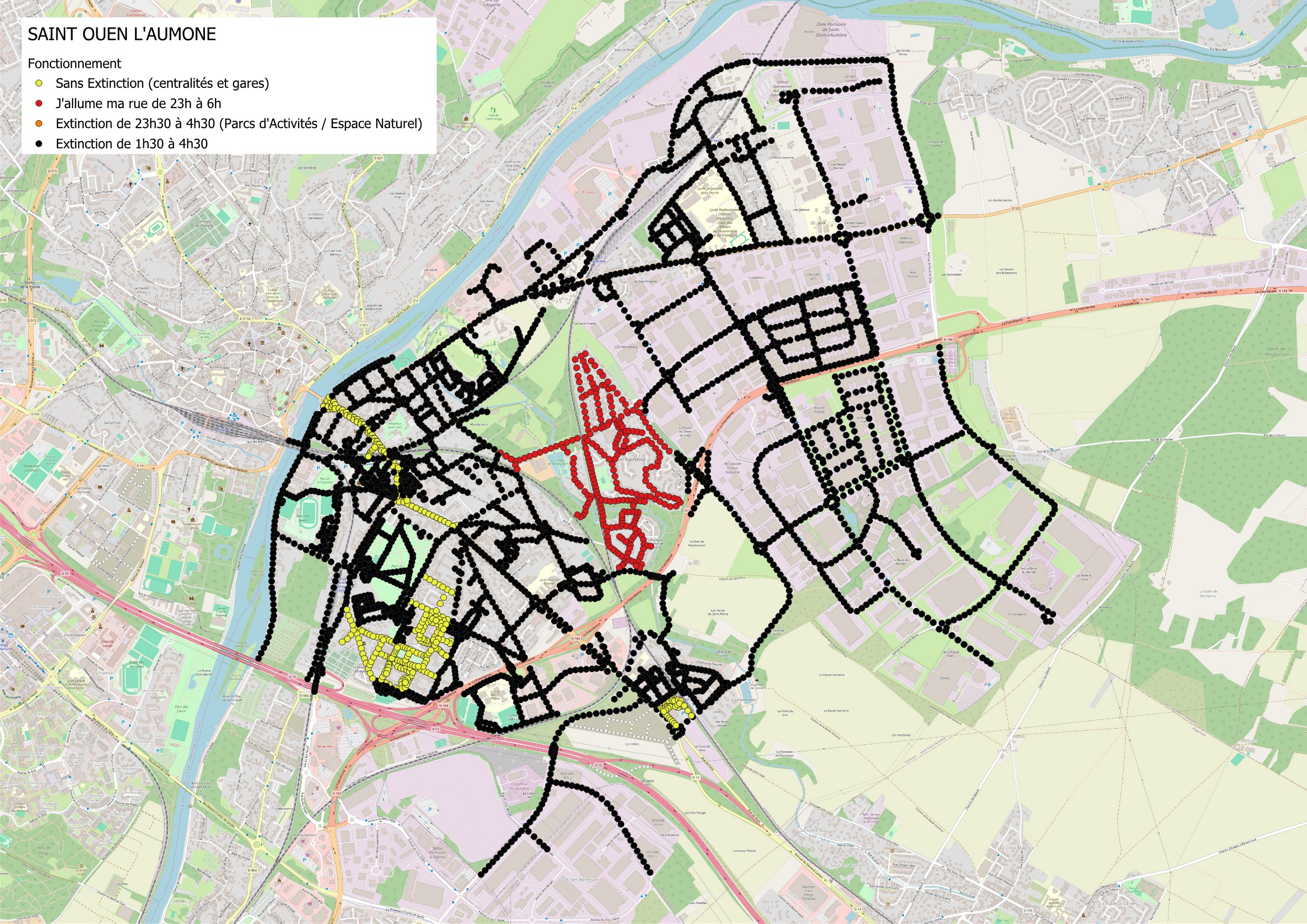 • zones identifiées en Rouge : extinction de 23h00 à 6h00, avec la possibilité de rallumer avec « J’allume ma Rue »